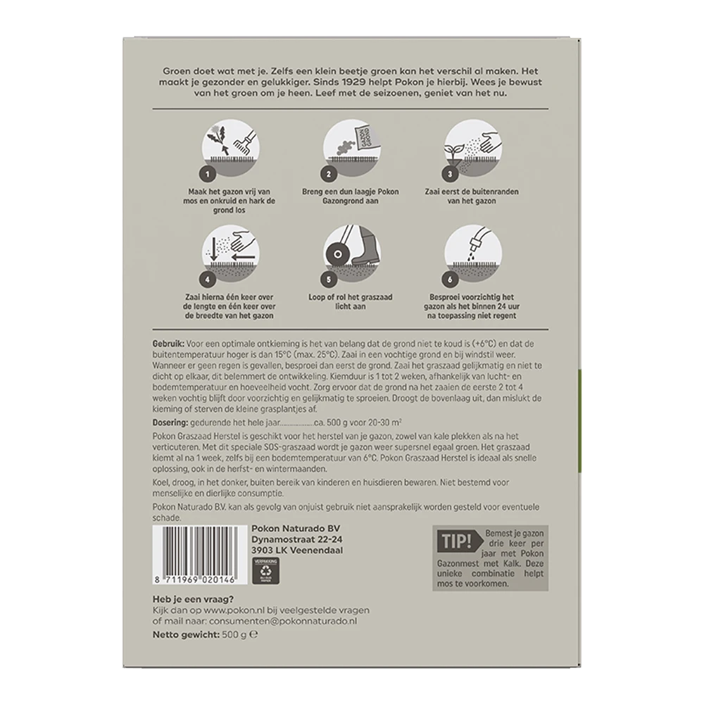 Pokon Graszaad Herstel is geschikt voor het herstel van je gazon, zowel van kale plekken als na het verticuteren. Met dit speciale SOS-graszaad wordt je gazon weer supersnel egaal groen. Het graszaad kiemt al na 1 week, zelfs bij een bodemtemperatuur van 6°C. Pokon Graszaad Herstel is ideaal als snelle oplossing, ook in de herfst- en wintermaanden. Voor een optimale ontkieming is het van belang dat de grond niet te koud is (+6°C.) en dat de buitentemperatuur hoger is dag 15°C (max 25°C). Zaai in een vochtige grond en bij windstil weer. Wanneer er geen regen is gevallen, besproei dan eerst de grond. Zaai het graszaad gelijkmatig en niet te dicht op elkaar, dit belemmert de ontwikkeling. Kiemduur is 1 tot 2 weken, afhankelijk van lucht- en bodemtemperatuur en hoeveelheid vocht. Zorg ervoor dat de grond na het zaaien de eerste 2 tot 4 weken vochtig blijft door voorzichtig en gelijkmatig te sproeien. Droogt de bovenlaag uit, dan mislukt de kieming of sterven de kleine grasplantjes af.